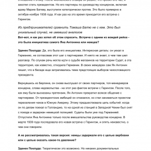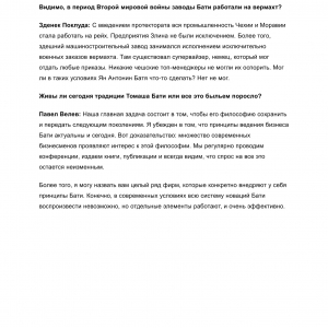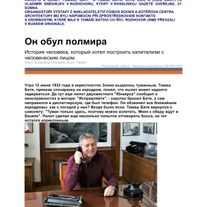 ORGANIZÁTOŘI VÝSTAVY Z NAKLADATELSTVÍ FOIBOS BOOKS A KOTĚROVA CENTRA ARCHITEKTURY MU BYLI NÁPOMOCNI PŘI ZPROSTŘEDKOVÁNÍ KONTAKTŮ S OSOBNOSTMI, KTERÉ MAJÍ K TOMÁŠI BAŤOVI CO ŘÍCI. ROZHOVOR JSME PŘEVZALI V RUSKÉM ORIGINÁLE.