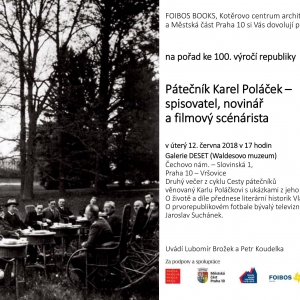 31.05.2018V úterý 12. června Vás zveme na druhý z cyklu podvečerních přednášek s názvem Cesty Pátečníků. Tentokrát Vás čeká povídání o spisovateli, novináři a filmovém scénáristovi Karlu Poláčkovi s ukázkami z jeho tvorby. O životě a díle spisovatele Karla Poláčka přednese literární historik Vladimír Křivánek. Pořad moderovaný Petrem Koudelkou a Lubomírem Brožkem začíná v 17:00 v Galerii DESET / Waldesově muzeu.