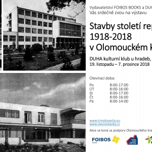 12.11.2018Srdečně Vás zveme na výstavu s názvem Stavby století republiky 1918-2018 v Olomouckém kraji uspořádanou u příležitosti stého výročí založení Československé republiky. Výstava bude k navštívení v Kulturním klubu DUHA v Prostějově, Školní 4.