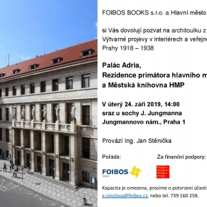 Tentokrát bude sraz na Jungmannově náměstí u sochy J. Jungmanna ve 14:00. Trasa povede přes palác Adria k rezidenci primátora na Mariánském náměstí, kde se podíváme do interiéru této krásné budovy.