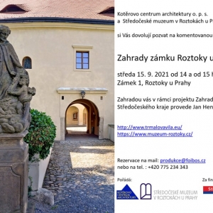 02.09.2021Zveme Vás na komentovanou prohlídku zahrady zámku Roztoky u Prahy, kterou vás provede Ing. arch. Jan Hendrych. Procházka se uskuteční ve středu 15. září od 14:00 a od 15:00. Rezervace míst na e-mailu: produkce@foibos.cz nebo na tel.: +420 775 234 343