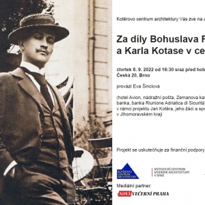 Architoulka za díly Bohuslava Fuchse a Karla Kotase v centru Brna (hotel Avion, nádražní pošta, Zemanova kavárna, Moravská banka, banka Riunione Adriatica di Sicuritá), provází Eva Šinclová