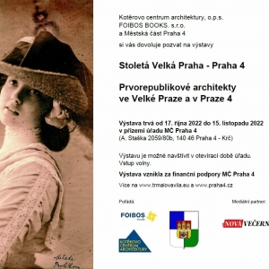 17.10.2022Kotěrovo centrum architektury, o.p.s., FOIBOS BOOKS. s.r.o. a Městská část Praha 4 si vás dovoluje pozvat na výstavy " Stoletá Velká Praha - Praha 4" a "Prvorepublikové architekty ve Velké Praze a v Praze 4".