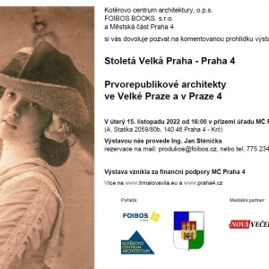 10.11.2022Kotěrovo centrum architektury, o.p.s. a FOIBOS BOOKS. s.r.o. a Městská část Praha 4 si vás dovoluje pozvat na komentovanou prohlídku výstavy "Stoletá Velká Praha - Praha 4" a "Prvorepublikové architekty ve Velké Praze a v Praze 4". Výstavou nás provede Ing. Jan Stěnička.