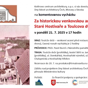 11.07.2025Všechny příznivce historie, architektury i pohybu na čerstvém vzduchu zveme v pondělí 21. 7. 2025 do Hostivaře na komentovanou vycházku "Za historickou venkovskou architekturou Staré Hostivaře a Toulcova dvora".