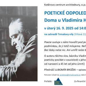 05.09.2025U příležitosti básníkova dvojitého výročí (120 let od narození a 45 let od jeho úmrtí) si vás dovolujeme pozvat na POETICKÉ ODPOLEDNE "Doma u básníka Vladimíra Holana" - v úterý 16. září od 14 hodin v Trmalově vile (za hezkého počasí na zahradě vily).