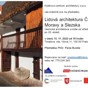 Kotěrovo centrum architektury o.p.s. vás srdečně zve v úterý 15.11.2022 od 18 hodin do Trmalovy vily na přednášku Lidová architektura Čech Moravy a Slezska - Vesnická architektura a sídla od středověku po 20. století.
