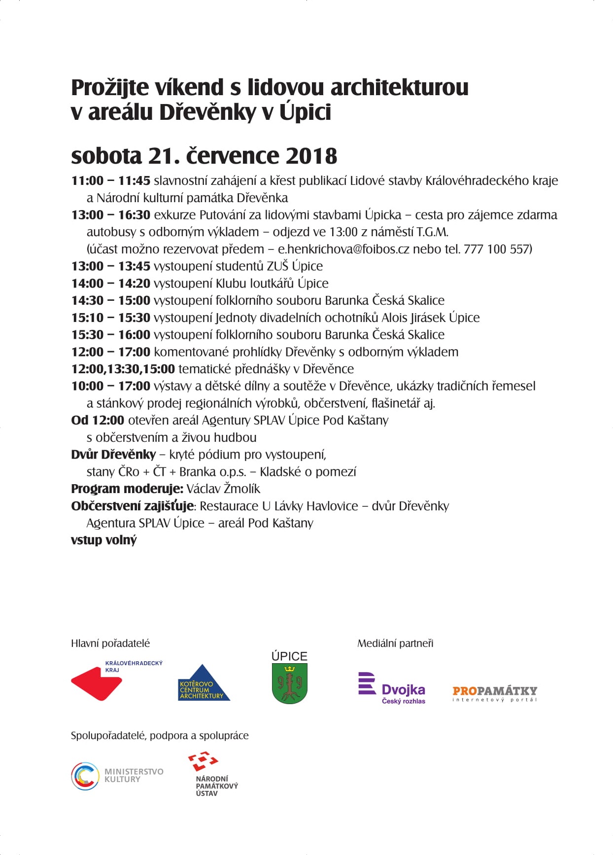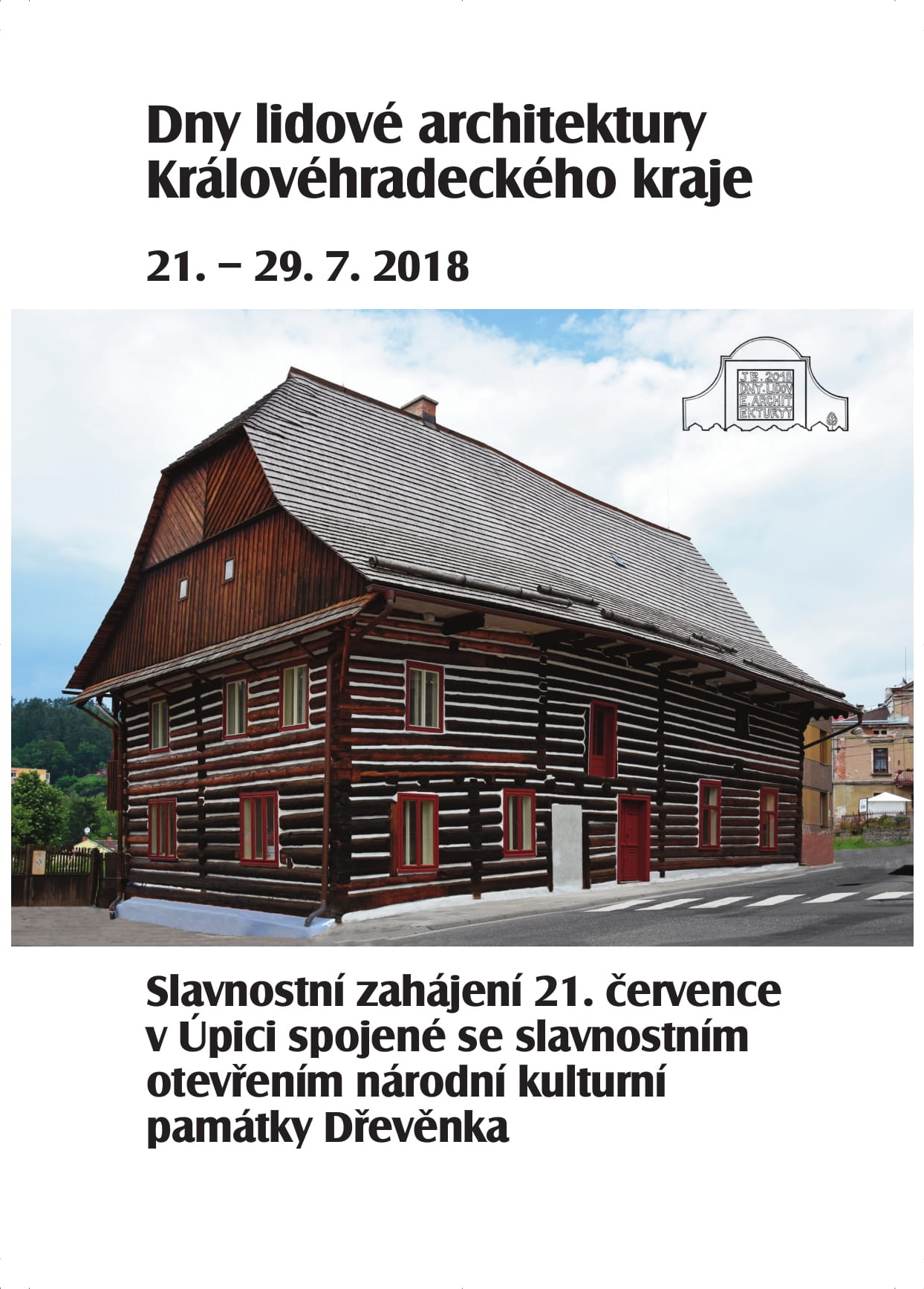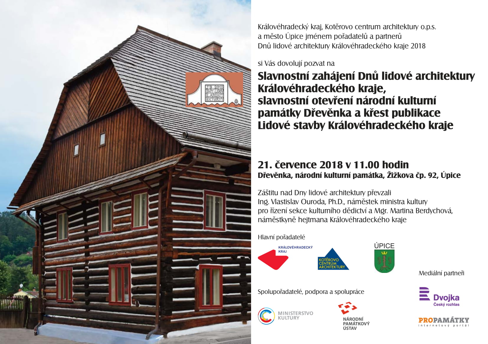 04.07.2018Královéhradecký kraj, Kotěrovo centrum architektury o.p.s. a město Úpice jménem pořadatelů a partnerů Dnů lidové architektury Královéhradeckého kraje 2018 si Vás dovolují pozvat na Slavnostní zahájení 21. července v Úpici spojené se slavnostním otevřením národní kulturní památky Dřevěnka.