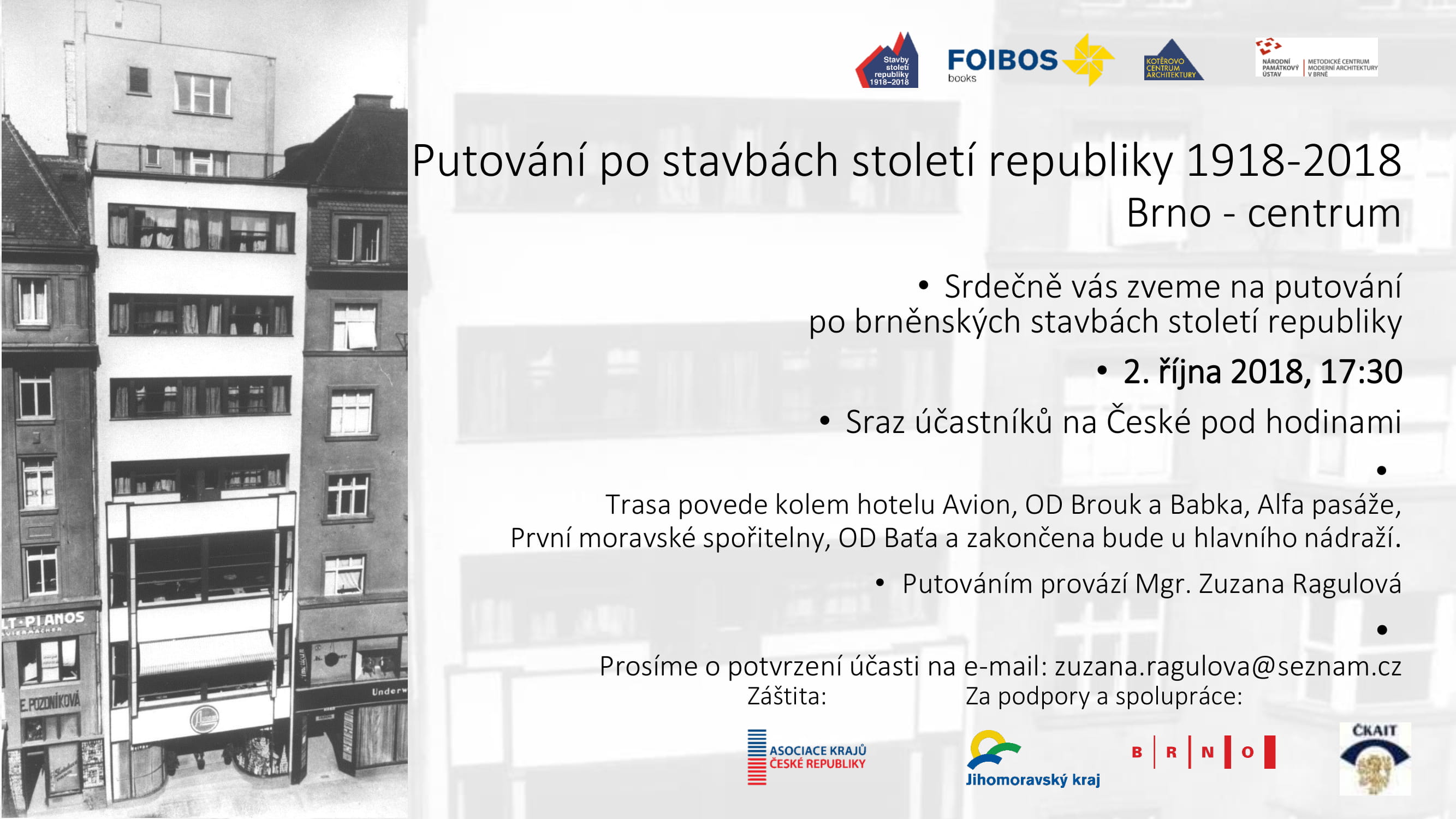 Sraz účastníků bude v 17:30 na České pod hodinami. Prohlídka bude vedena centrem Brna a pozornost bude věnována významným stavbám, které vznikly za období od vzniku republiky do dneška.