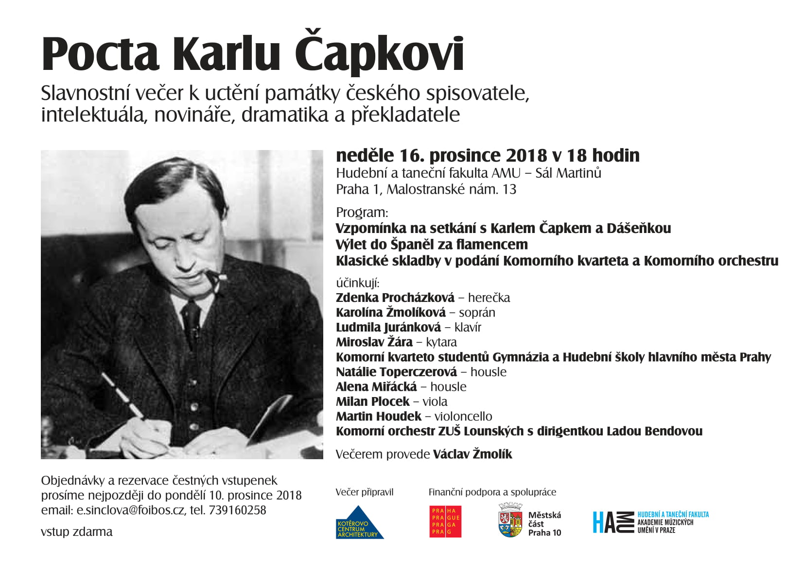 22.11.2018Co nejsrdečněji Vás zveme na slavnostní koncert uspořádaný k uctění památky významného českého spisovatele, intelektuála, novináře, dramatika a překladatele Karla Čapka. Vzpomínkový večer se uskuteční na Hudební a taneční fakultě AMU v Sále Martinů na Malostranském nám. 13, Praha 1 v neděli 16. prosince od 18:00.