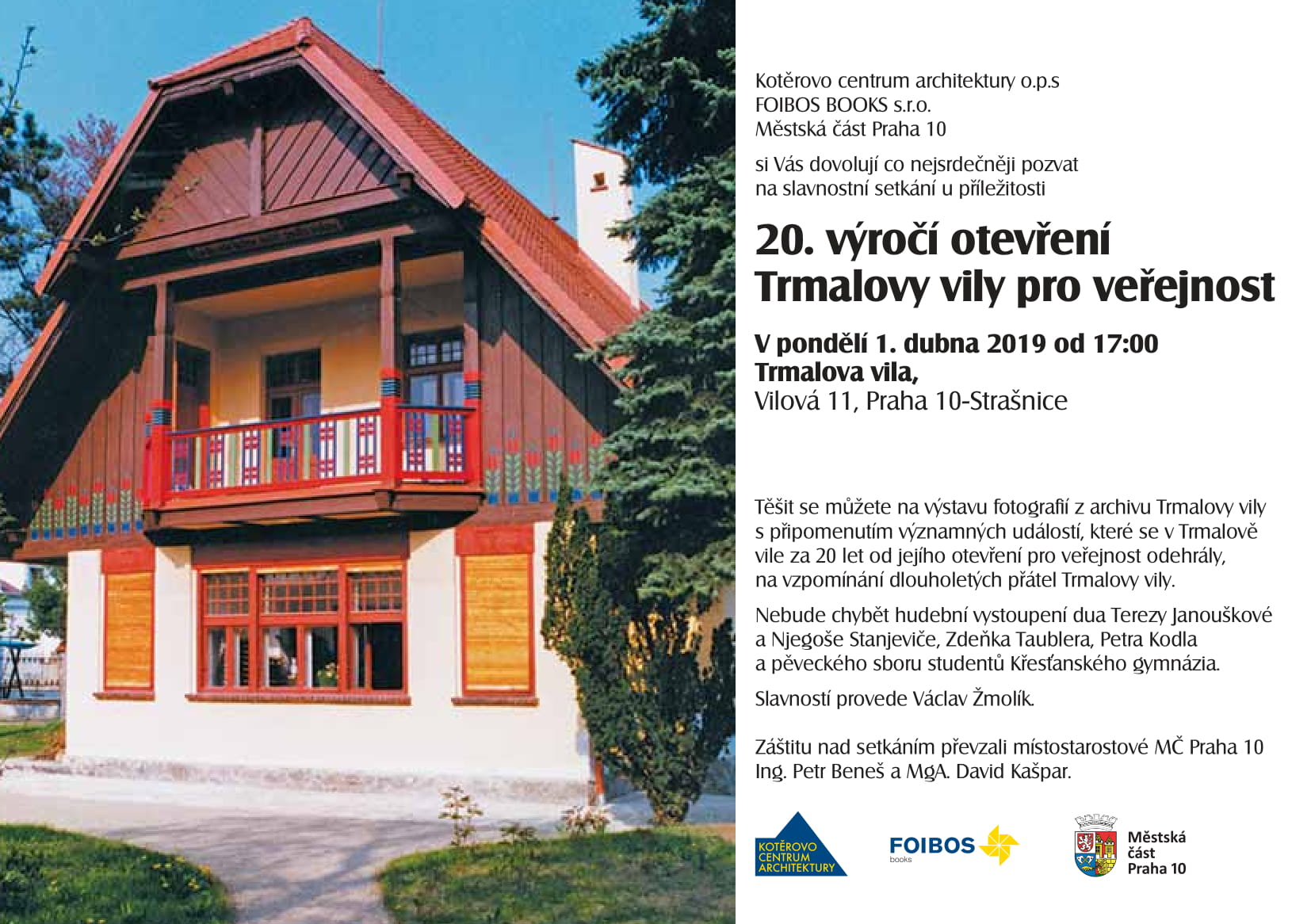 15.03.2019Kotěrovo centrum architektury o.p.s, FOIBOS BOOKS s.r.o. a Městská část Praha 10 si Vás dovolují co nejsrdečněji pozvat na slavnostní setkání u příležitosti 20. výročí otevření Trmalovy vily pro veřejnost