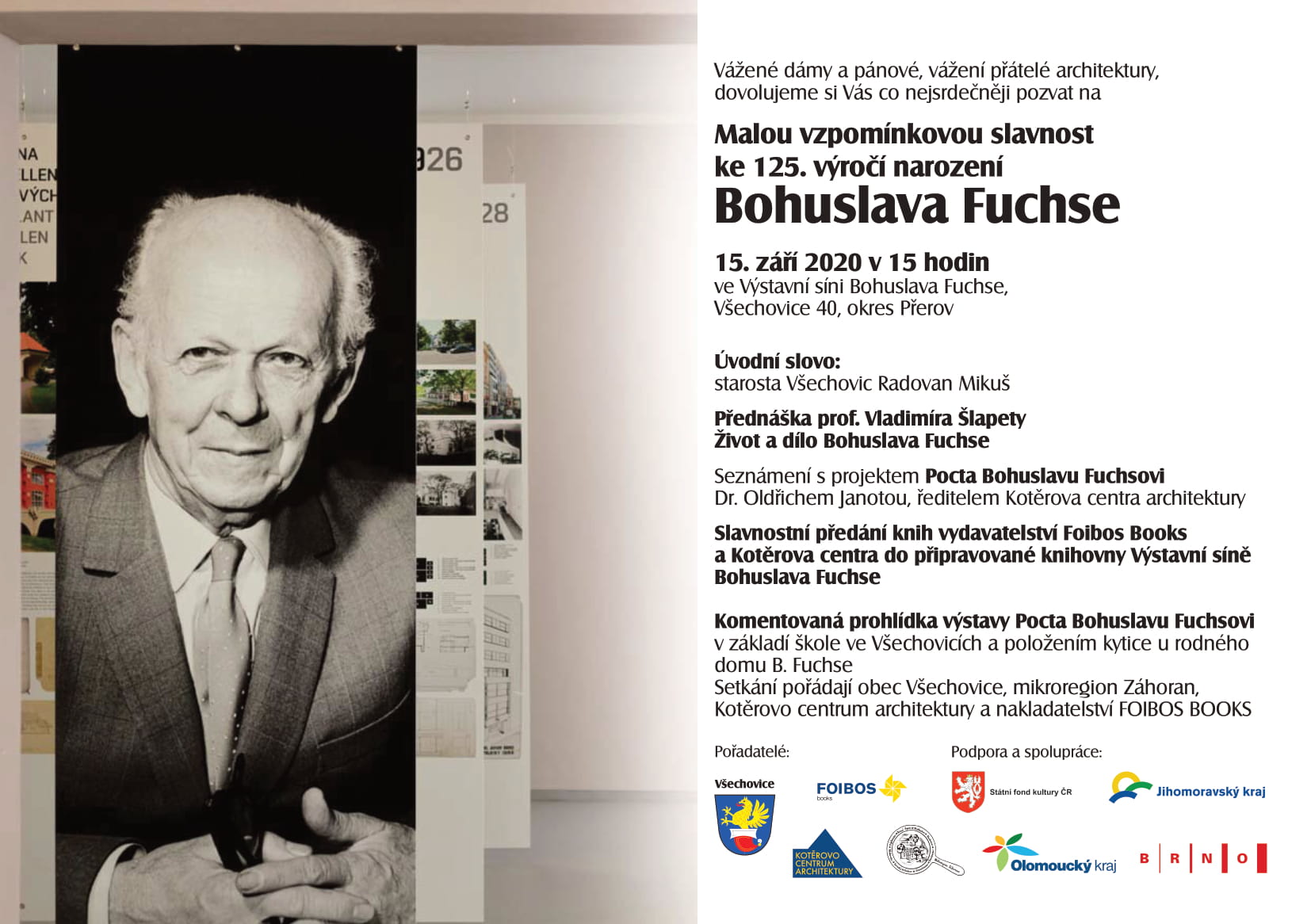 02.09.2020Zveme Vás na malou vzpomínkovou slavnost ke 125. výročí narození Bohuslava Fuchse. Událost se uskuteční 15. září 2020 v 15:00 ve Výstavní síni Bohuslava Fuchse ve Všechovicích. Slavnostním odpolednem provede starosta obce Všechovic Radovan Mikuš, prof. Vladimír Šlapeta a Dr. Oldřich Janota. Těšit se také můžete na komentovanou prohlídku výstavy Pocta Bohuslavu Fuchsovi, která bude k navštívení v základní škole ve Všechovicích. V rámci akce bude položena kytice u rodného domu B. Fuchse.