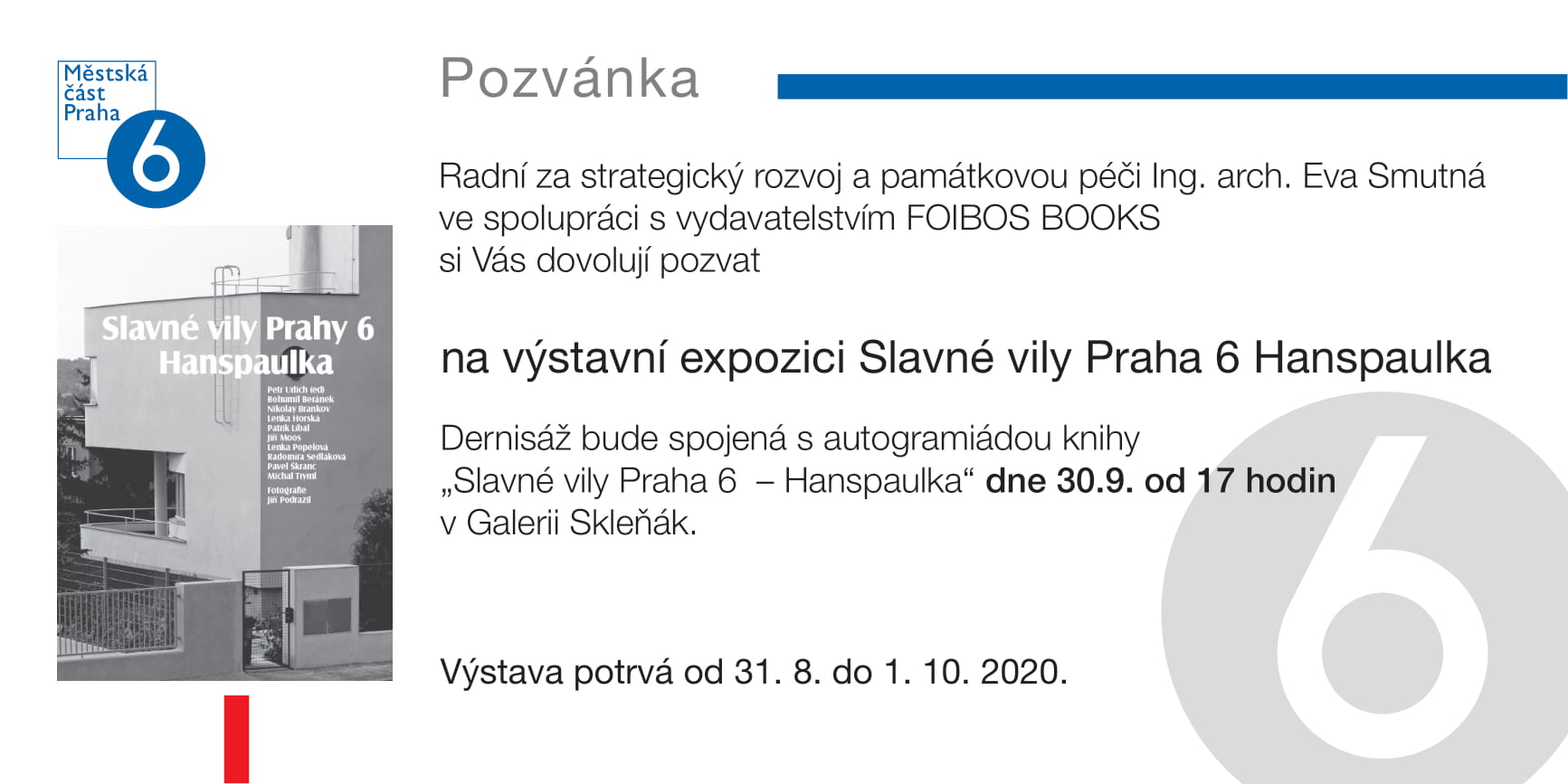 22.09.2020Na konci září letošního roku vyjde v nakladatelství FOIBOS BOOKS další z knih v oblíbené edici Slavných vil, tentokrát o vilách na Hanspaulce. K vydání knihy Připravila Praha 6 ve spolupráci s nakladatelstvím stejnojmennou výstavu v Galerii Skleňák. Během dernisáže bude uspořádána autogramiáda autorů.