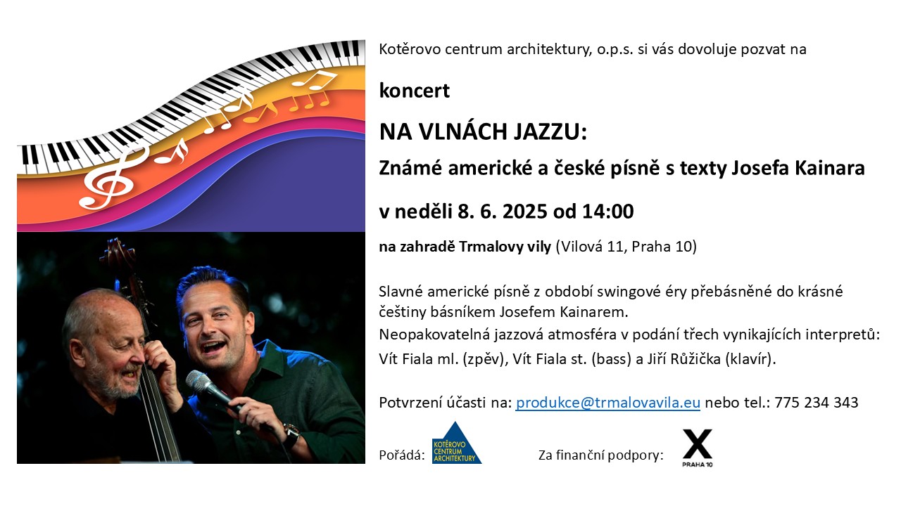 dovolujeme si vás pozvat na červnový koncert "NA VLNÁCH JAZZU: Známé americké a české písně s texty Josefa Kainara", který se uskuteční na zahradě Trmalovy vily.