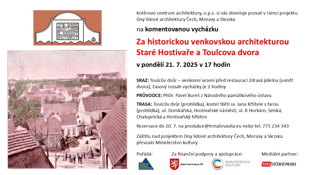 11.07.2025Všechny příznivce historie, architektury i pohybu na čerstvém vzduchu zveme v pondělí 21. 7. 2025 do Hostivaře na komentovanou vycházku "Za historickou venkovskou architekturou Staré Hostivaře a Toulcova dvora".
