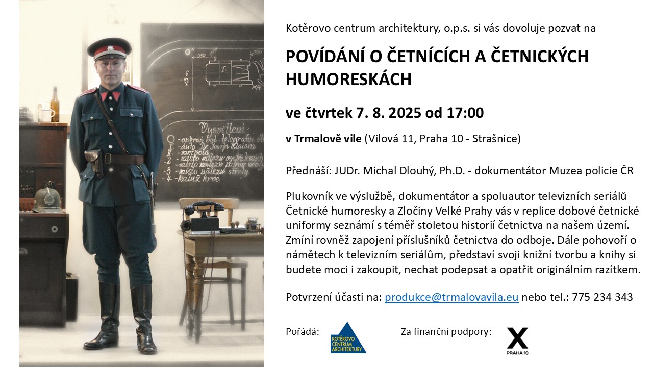 srdečně vás zveme na zajímavou přednášku spoluautora TV seriálů Četnické humoresky a Zločiny velké Prahy, která se uskuteční ve čtvrtek 7. 8. od 17:00 v Trmalově vile.