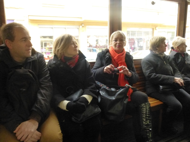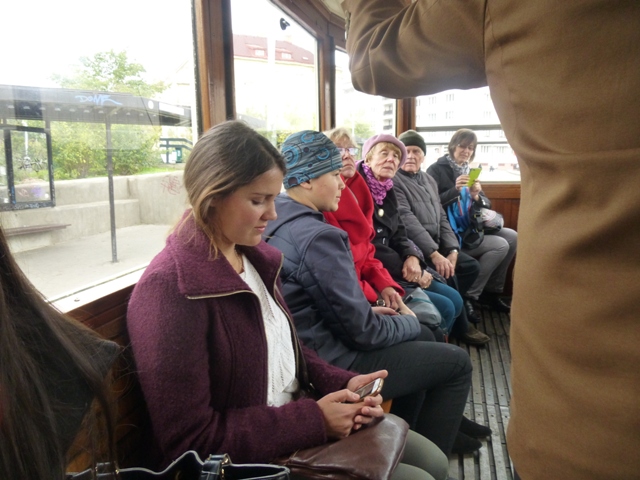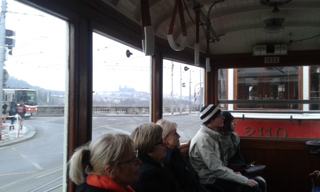 Potom jsme se vydali na nedalekou tramvajovou zastávku Vozovna Strašnice, kde celá skupina nastoupila do motorového a vlečného vozu historické tramvaje.