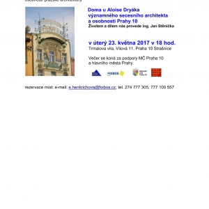 a Městská část Praha 10 dovolují pozvat na přednáškový večer z cyklu Rok osobností pražské architektury s názvem Doma u Aloise Dryáka významného secesního architekta a osobnosti Prahy 10, který se uskuteční v úterý 23. května v 18 hodin. Životem a dílem tohoto architekta nás provede ing. Jan Stěnička.