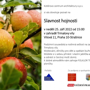 V neděli 25. 9. od 15 hodin vás zveme do zahrady Trmalovy vily na Slavnost hojnosti. Podzimní sousedskou a rodinnou sešlost na zahradě Trmalovy vily. Můžete se těšit na moštování, ochutnávku vín – vinobraní, opékání buřtů.