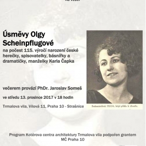 Kotěrovo centrum architektury, Foibos Books a Městská část Praha 10 Vás srdečně zvou na předvánoční večer na téma Úsměvy Olgy Schneipflugové, který se koná na počest 115. výročí jejího narození ve středu 13. prosince od 18 hod v Trmalově vile.
